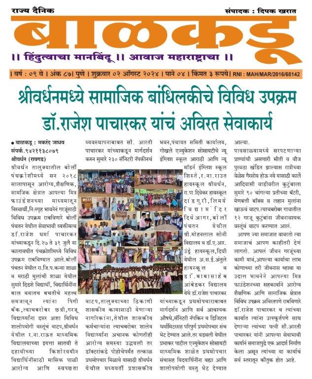 In 2023, we focused on menstrual hygiene awareness reaching 400+ schoolgirls, organized medical camps, distributed solar lamps and emergency torch lights, supported talented students in sports, and provided regular health check-ups and medical assistance to villagers.